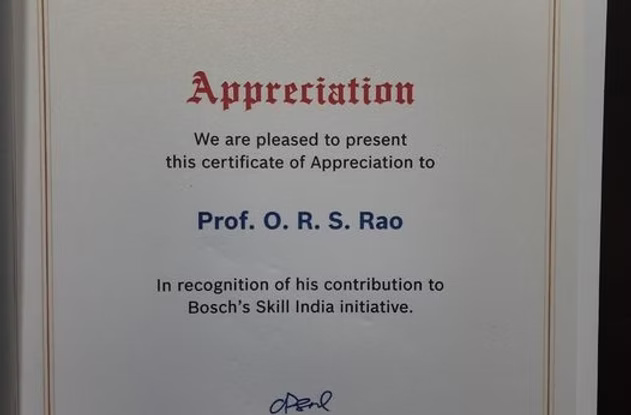 Letter of appreciation from Bosch for contribution to Skills India initiative